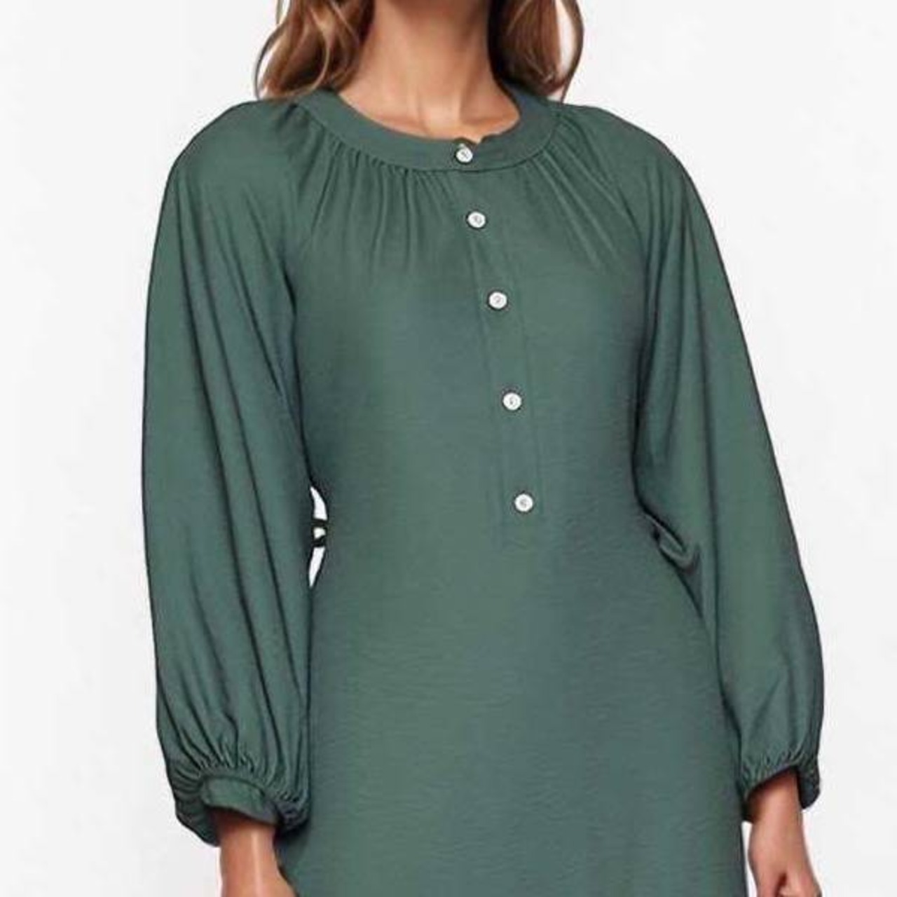 ヨーロッパらしいグレイッシュなブルーグリーンにパフスリーブデザインが女性らしさを引き立てシンプルながらも印象深いコーディネートに仕上がります。