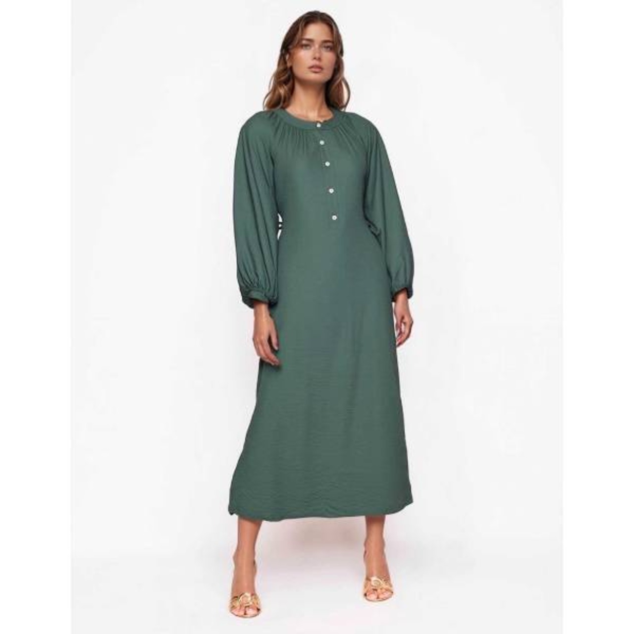 【 再入荷 】ブルーグリーン 無地ロングワンピース パフスリーブ 長袖ワンピース レディースワンピース【フランス インポート Joy's(ジョイズ)】 F2508004 F2511024