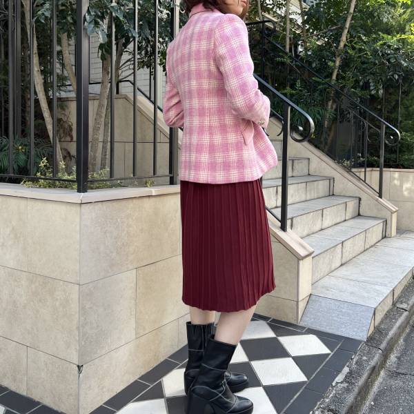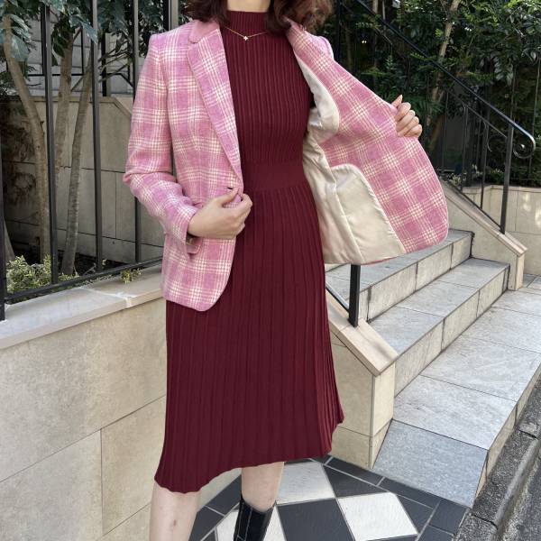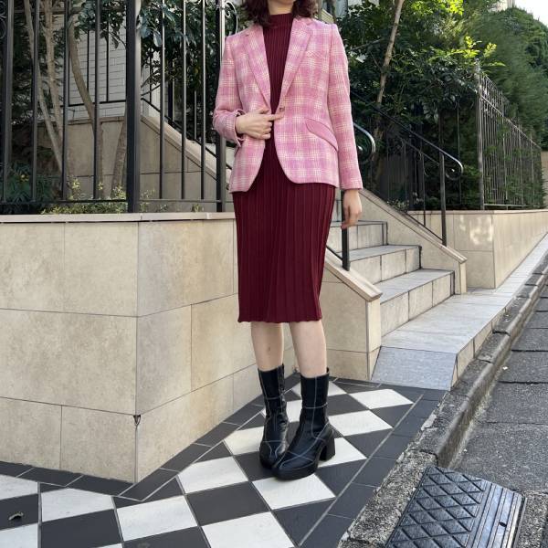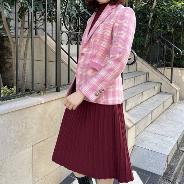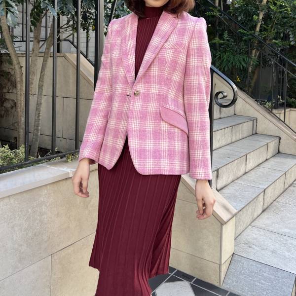 ピンク マドラスチェック×ベルベット テーラードジャケット アイボリー裏地付き ウール レディースインポートジャケット【スペインインポート TINTA(ティンタ)】 F2510022