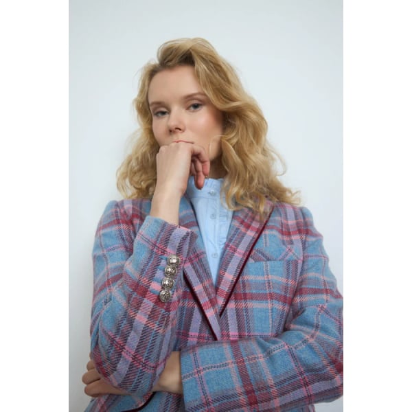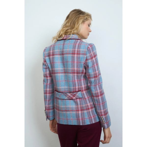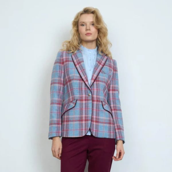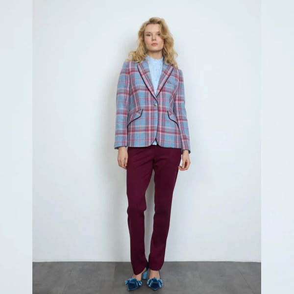 ブルーピンク マドラスチェック×ベルベットパイピング テーラードジャケット スカイブルー裏地付き ウール レディースインポートジャケット【スペインインポート TINTA(ティンタ)】 F2510023