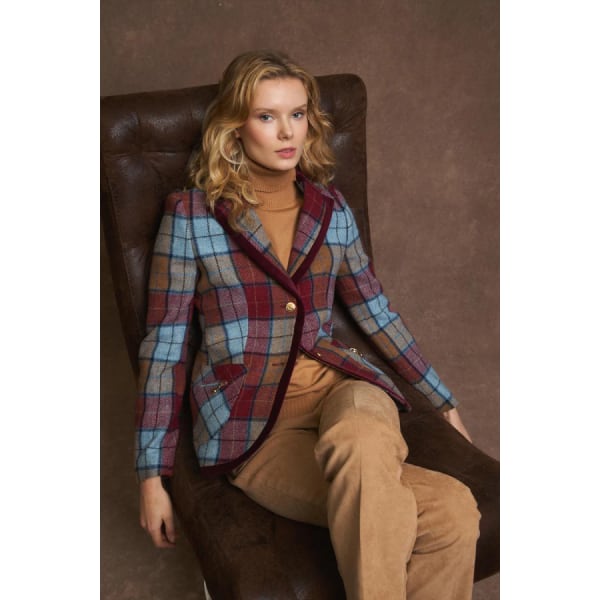 マルチカラー マドラスチェック×ベルベット テーラードジャケット スカイブルー裏地付き ウール レディースインポートジャケット【スペインインポート TINTA(ティンタ)】 F2510021