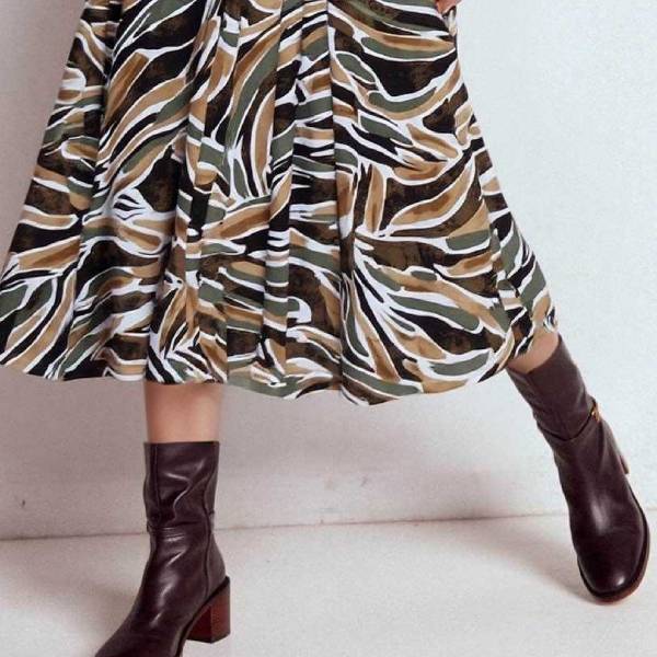 ウエスト上部から広がるハギが、美しい自然なシルエットを作ります。