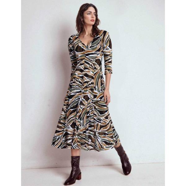 カーキ ストレッチワンピース ウエーブプリント ロングワンピース Vネック 7分袖 ヒートファブリック レディースワンピース【フランス インポート Joy's(ジョイズ)】 F2511021 KH