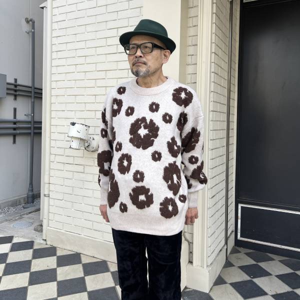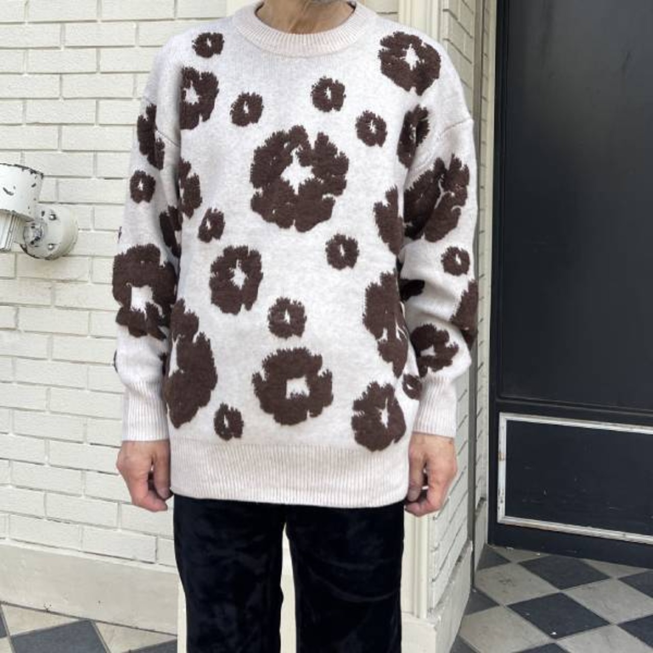 ゆったりとしたサイズ感の総柄ニットトップスでリラックスした雰囲気です。