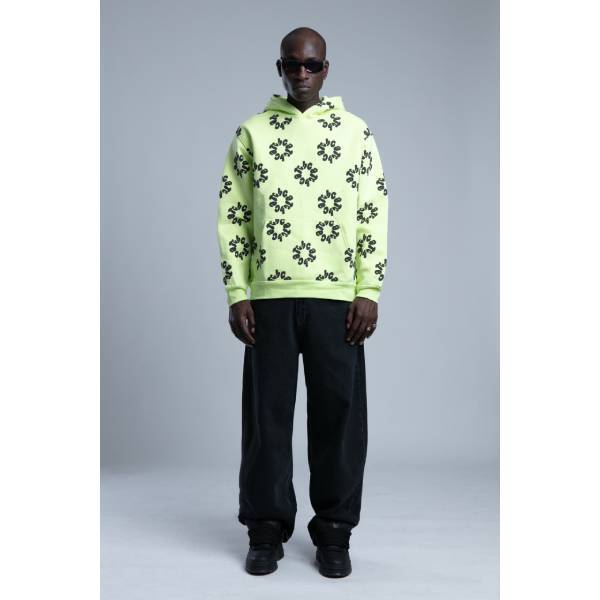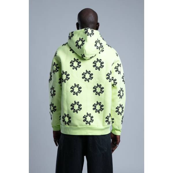 蛍光色に近い、明るいグリーンにブラックのデザイン文字がプリントされたオーバーサイズのトレーナーです。