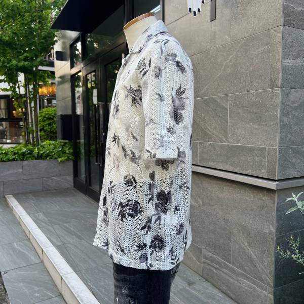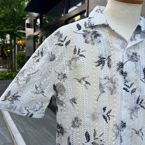 アイボリー×ホワイト フラワー×むら染め メッシュ半袖シャツ 開襟シャツ レースシャツ 柄シャツ メンズシャツ インポートシャツ【フランスインポート Yves Enzo(イヴエンツォ)】 F2603042