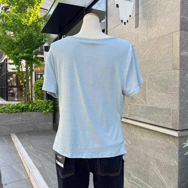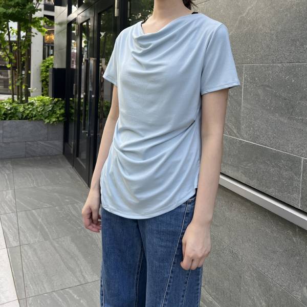 ブルー無地プレーン ドレープデザインTシャツ 半袖トップス シルクタッチ レディーストップス インポートトップス【フランスインポート J&H】 F2604039
