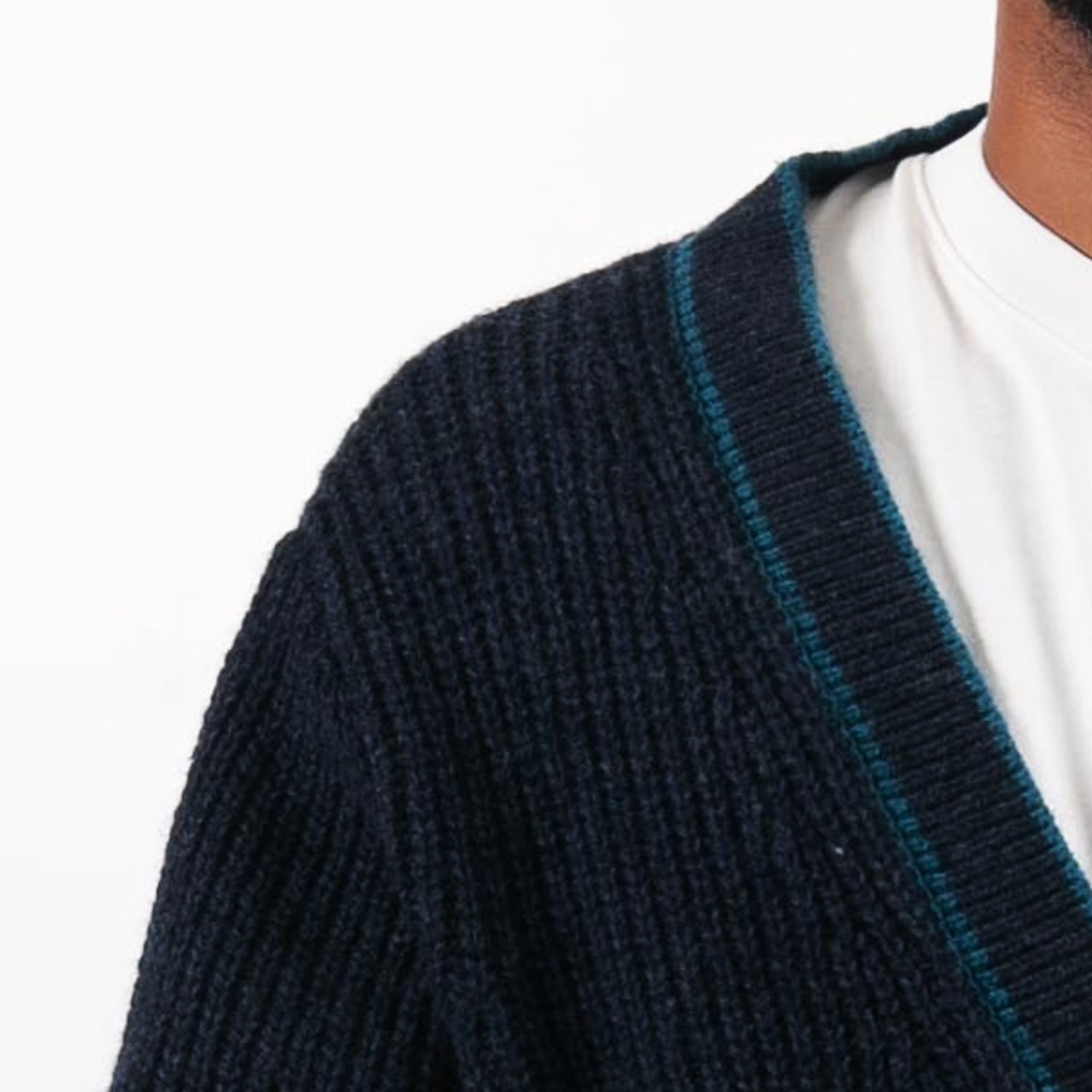 ブラックベースにブルーのラインが映える、長袖ニットカーディガンです。