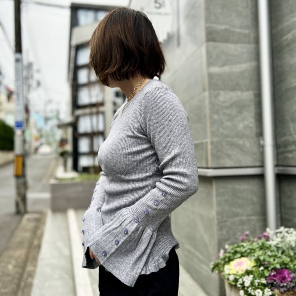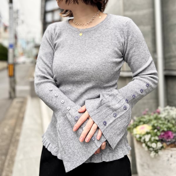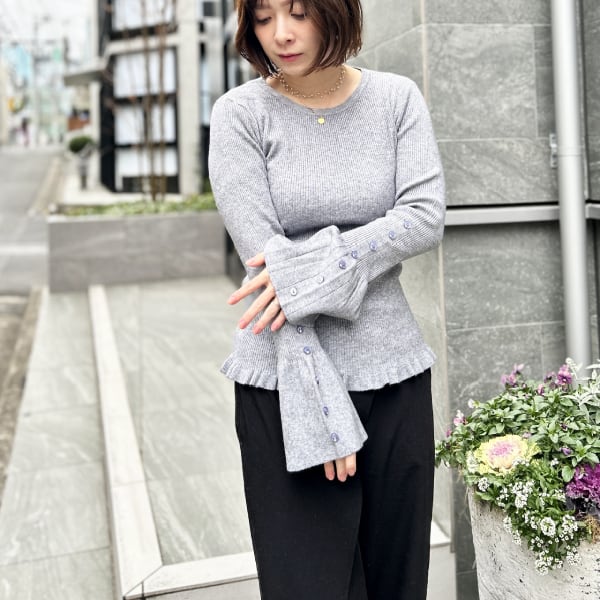 袖口が広がりフリルデザインになっているこのトップスは華やかさと可愛らしさ兼ね備えています。