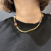 存在感のあるゴールドチェーンの間には、宝石箱から飛び出したかのような鮮やかなカラーストーンが。